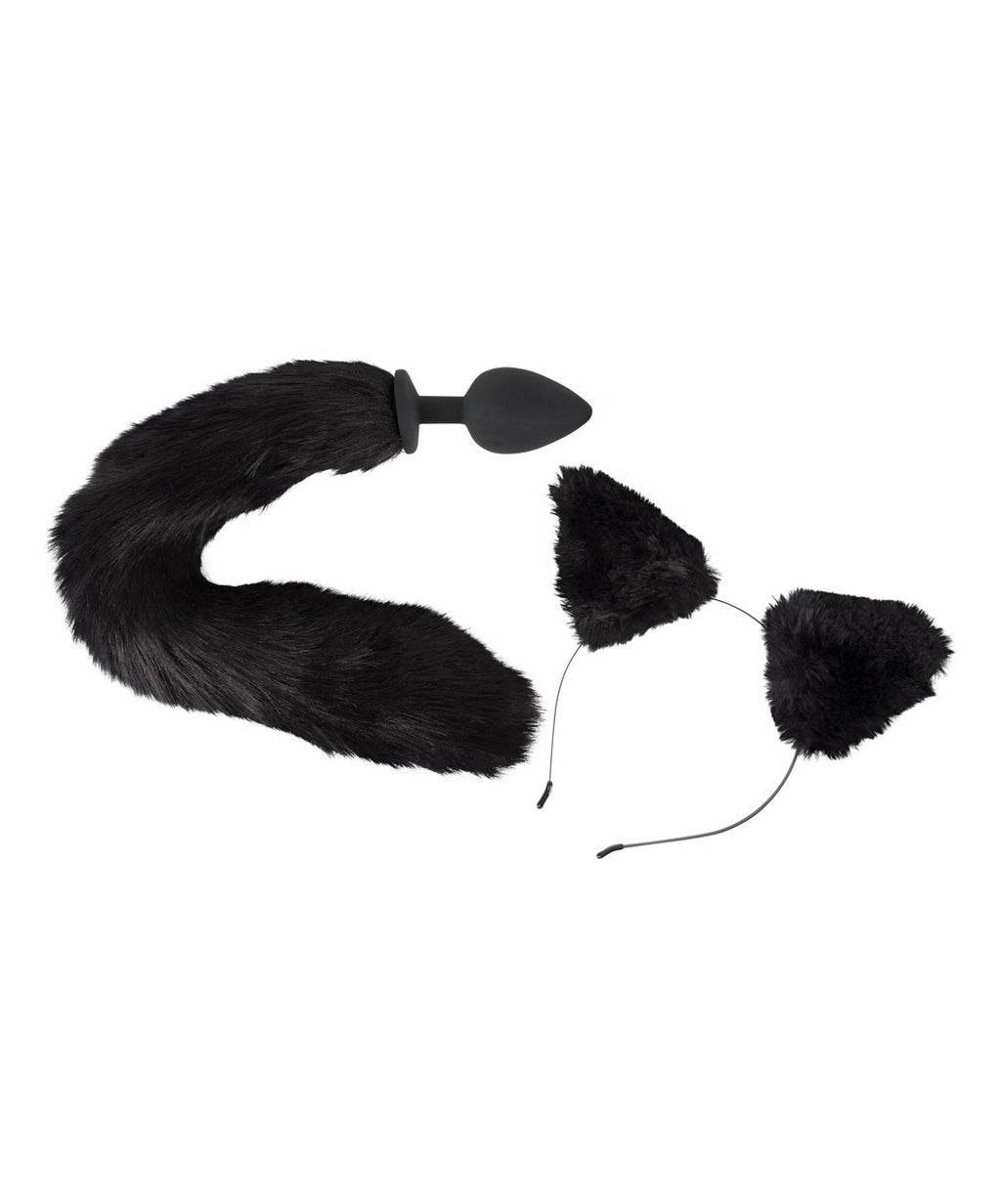 This black set is perfect for some animalistic anal play. It consists of a butt plug with approx. 38 cm long tail and metal headband with fluffy cat ears (approx. 7 cm long, pink on the inside). Headband 0.4 cm wide.