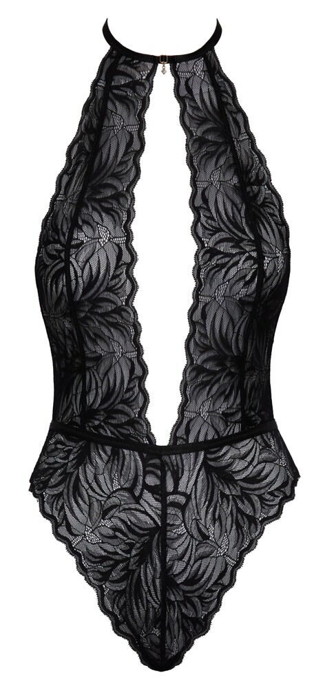 Seductive body from kissable completely made of fine black lace. Soft and stretchy all over for maximum comfort. Open back styling with large cut-out at the front from the neck to the waist. Neckband halterneck with bow and glitter stone details at the front and small hook fastening at the neck. Waistband with bow and glitter stone decoration at the back and small hook fastening at the side.