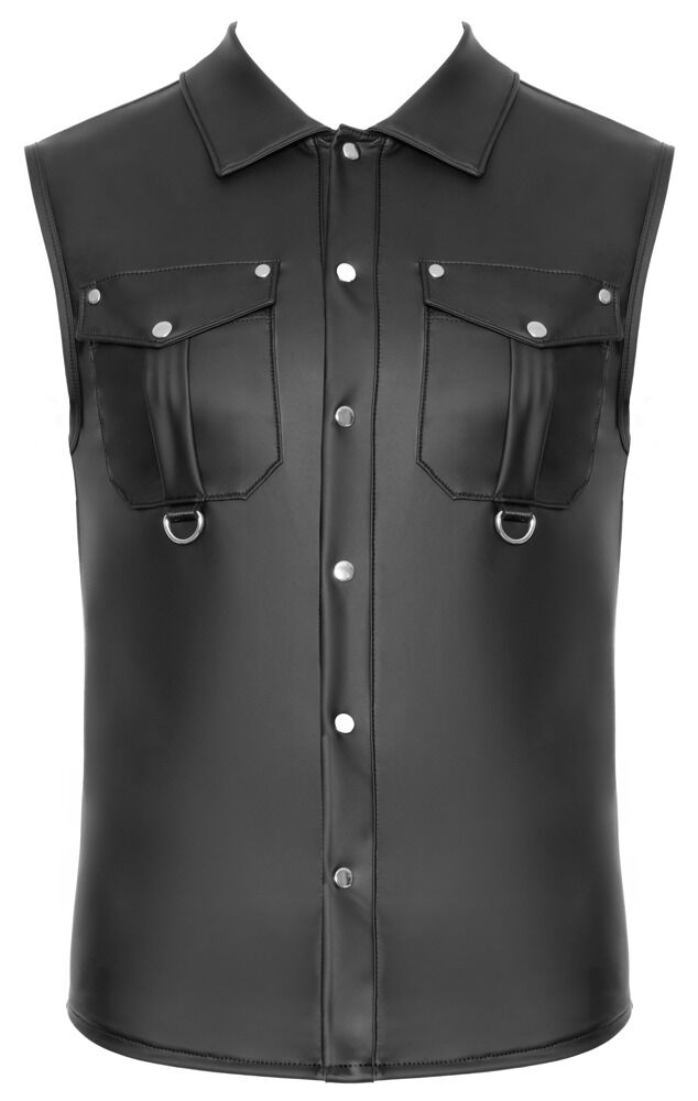 The sleeveless shirt from NEK is in a skin-tight design and it has press studs all the way down the front. It is made out of trendy black matte look material. Slightly flexible for a perfect and comfortable fit. The two chest pockets have D-rings.