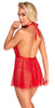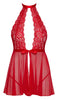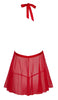 Short, flared babydoll from kissable in red transparency made of beautiful floral lace (top) and fine powernet (skirt). Silky soft and stretchy for high comfort. Front with generous neckline from halterneck to waistband. The satin ribbon halterneck ties at the neck, the satin waistband ties at the front. Backless. Matching small lace thong is included.