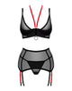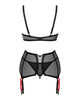3-piece set Glandez by Obsessive with underwired bra, suspender belt and thong. All in fine black transparency - soft and stretchy throughout for a high level of comfort. Bra with red halterneck as a stylish contrast as well as a ring and small jewellery element between the cups. The straps and hook fastener at the back can be adjusted to fit. The suspender belt also stands out in style with its additional, removable suspender straps in contrasting red. A total of 8 suspender straps can be adjusted to fit. The beautiful lacing at the back allows the suspender belt to be adjusted to fit perfectly.