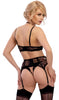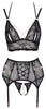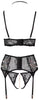 Bralette, suspender belt and crotchless briefs in a set from Abierta Fina. All pieces are made out of delicate and stretchy lace and they are decorated with rose-gold coloured elements and rhinestone chains. The bralette has sensual slits in the cups so the breasts can be exposed in the blink of an eye. The seductive crotchless briefs have a stimulating chain. The light suspender belt has decorative lacing at the front and adds the finishing touch to the erotic ensemble. The straps, halterneck and suspender straps can be adjusted for a perfect fit. All the chains are removable.